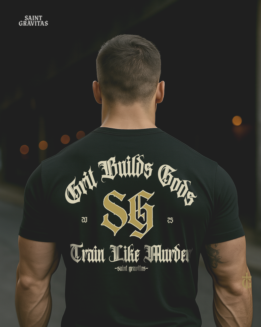 Left-chest SG mark; full back print: Grit Builds Gods / Train Like Murder