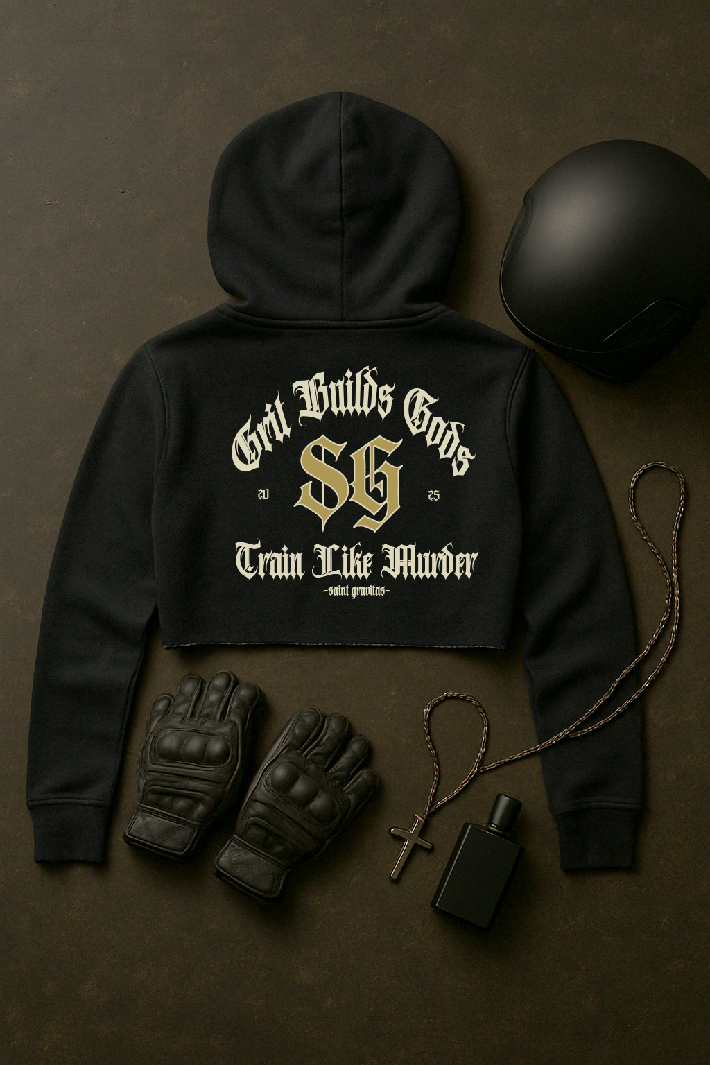 Light armor. Heavy intent. This cropped pullover is built for heat in the gym and menace on the street—throw it on, tighten the jaw, and move weight like you mean it. Subtle SG crest up front; the attitude does the rest.